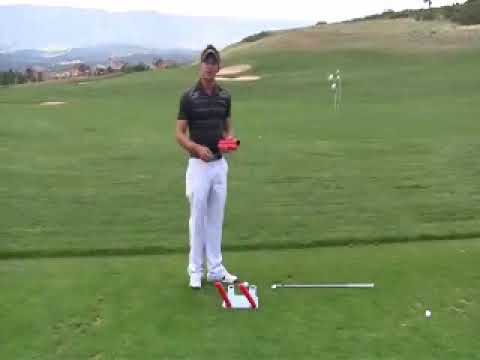 Step 1: Set a ball in front of the red line. Hit full shots with middle irons. To begin, tee up the ball just above the ground.